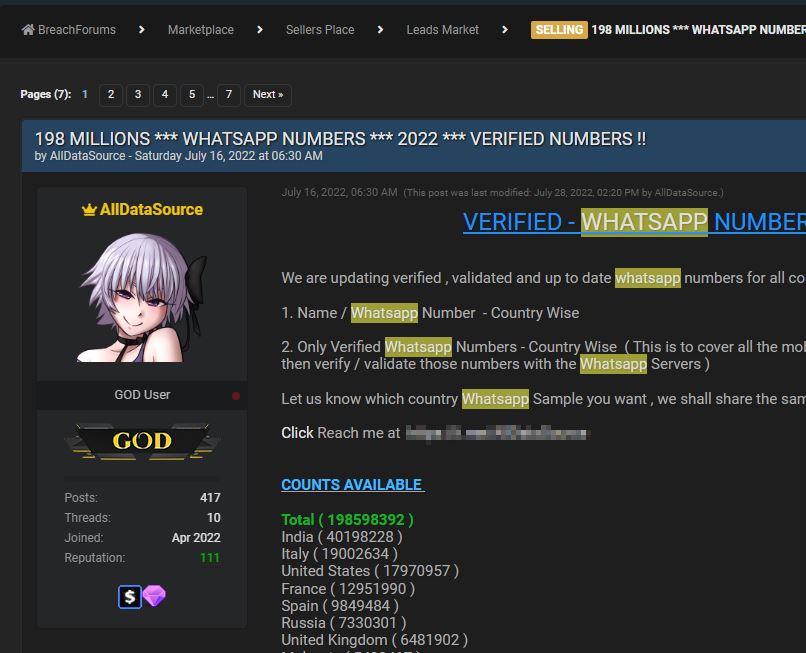 Leak: 198 MILLIONS *** WHATSAPP NUMBERS *** 2022 *** VERIFIED NUMBERS !!